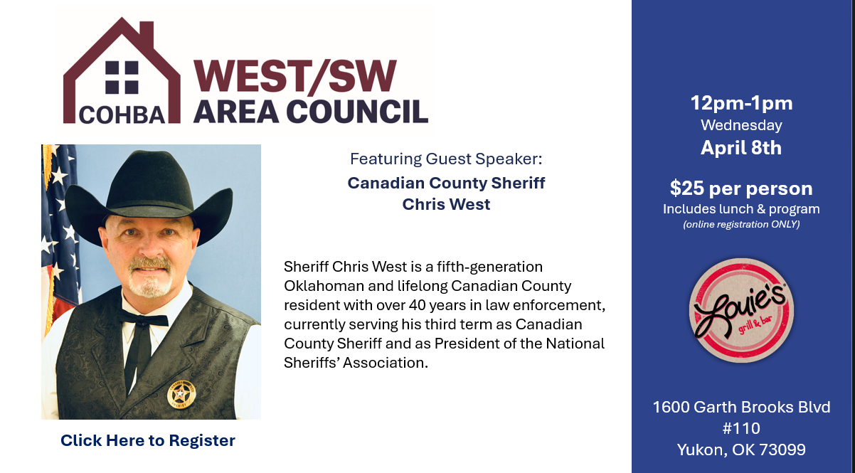 Area Council meetings focus on major issues and industry happenings that affect new home construction within a specific area of central Oklahoma. COHBA’s Area Councils include Edmond, Northwest, West/Southwest, and South Area Councils, and they meet quarterly within their designated area. If you build or do business within these areas, we highly encourage you to attend!