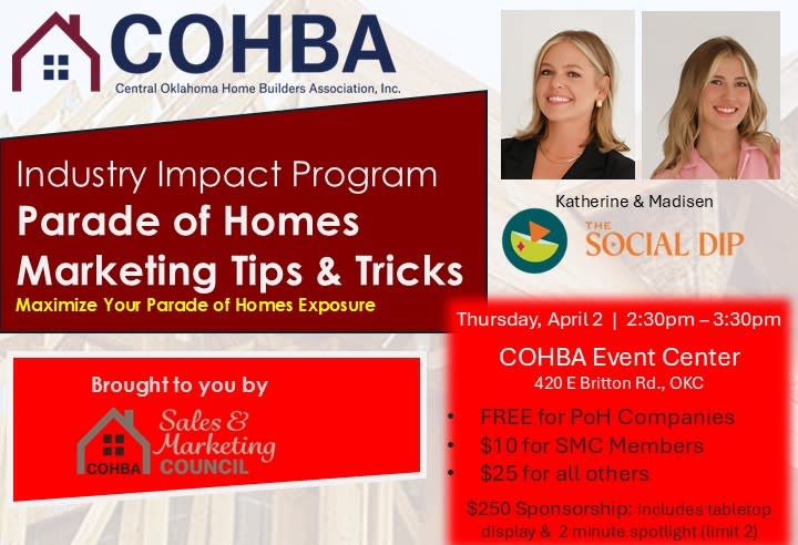 The Social Dip, the exclusive Parade of Homes Social Media Team, will share their promotions for Parade of Homes • How Builders and teams can collaborate for maximum visibility • Proven social media strategies to boost traffic, engagement and buzz • Tips to make your homes stand out before, during and after the Parade Whether you’re a Builder, Marketer or team member this session will help you get the most value and exposure from your Parade of Homes experience.